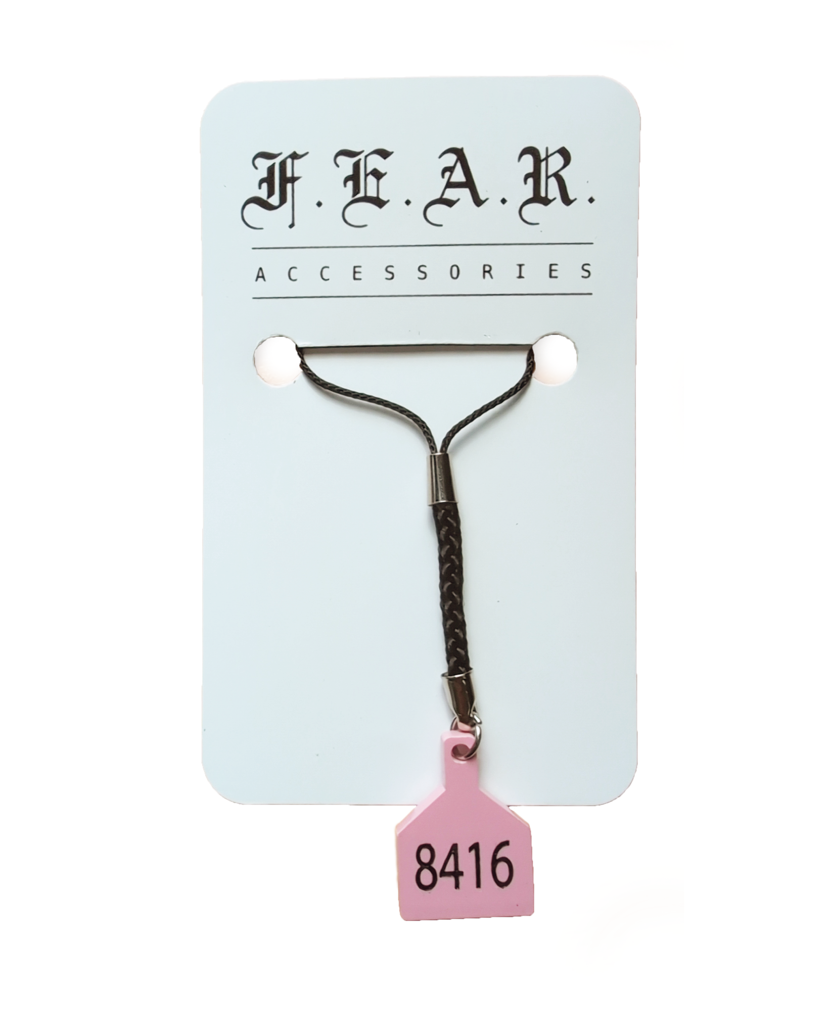 A keychain with a pink ear tag numbered 8416, in honour of Olivia, a sow at an intensive pig farm in Victoria, Australia, who was the victim of sexual abuse / bestiality by the son of the farm manager in early 2024.